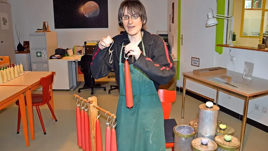 „Ich färbe selbst gezogene Kerzen. Dafür muss ich sie zweimal in roten Wachs tauchen, damit die Farbe am Ende auch kräftig genug ist“, sagt Jan-Jorma Kanter, während er vorsichtig eine noch warme Wachskerze zum Trocknen aufhängt. An der Freien Martinsschule Hannover-Laatzen habe er Kerzenziehen als Abschlussarbeit gemacht, erzählt er. Daher hätte er schon Erfahrungen damit gehabt und gewusst, dass ihm diese Aufgabe Spaß macht.