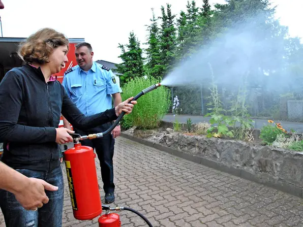 Anschaulich erläutern die Brandschutzerzieher den Verbrennungsvorgang. An einem sogenannten Rauchhaus wird den Mitarbeitern erklärt, wie gefährlich die rasche Ausbreitung von Rauch ist und wie wichtig Rauchwarnmelder in einem Haus sind. Und dann wird es sogar ganz praktisch: Die Mitarbeiter dürfen im Garten die Feuerlöscher bedienen – und sorgen zum Teil für ungewollte Duschen.